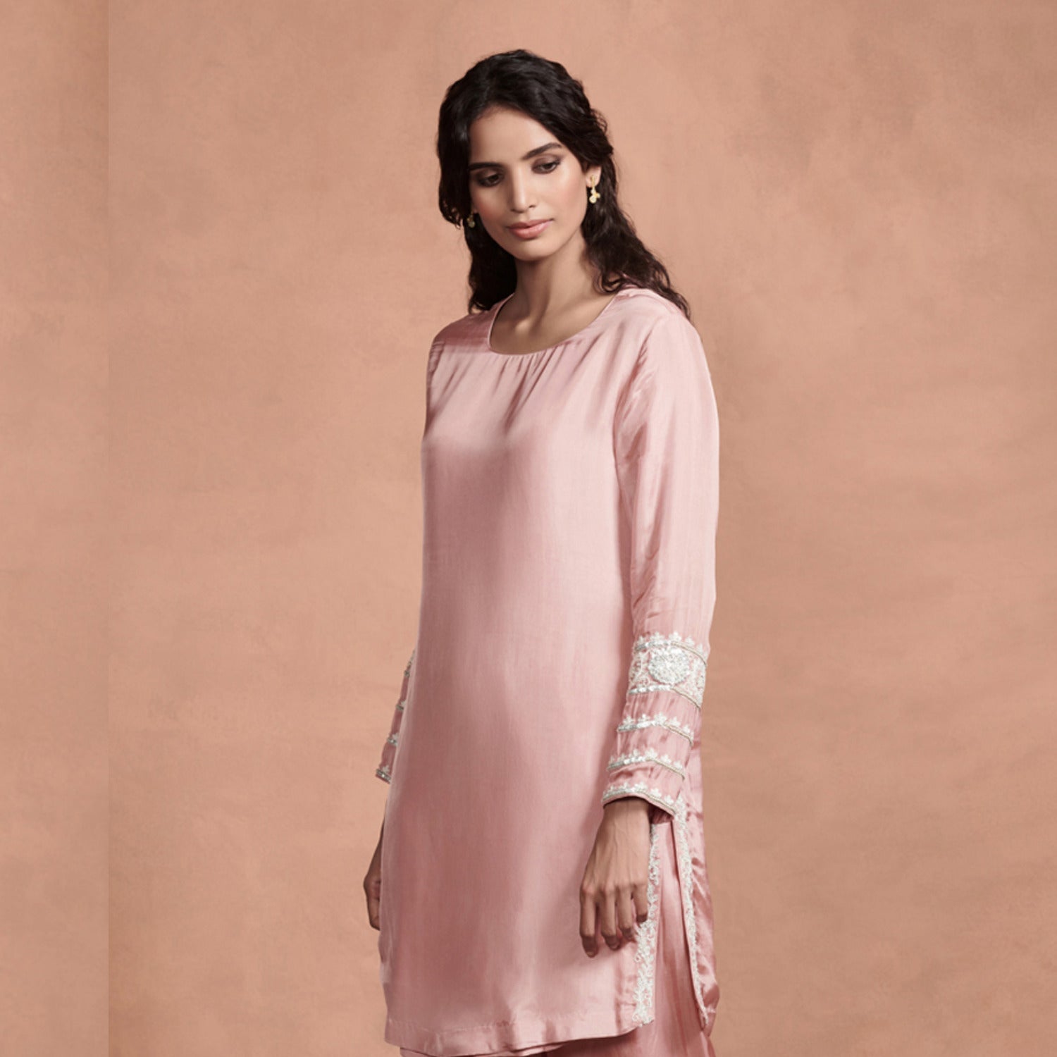 Jeweled short kurta set in peach stones.