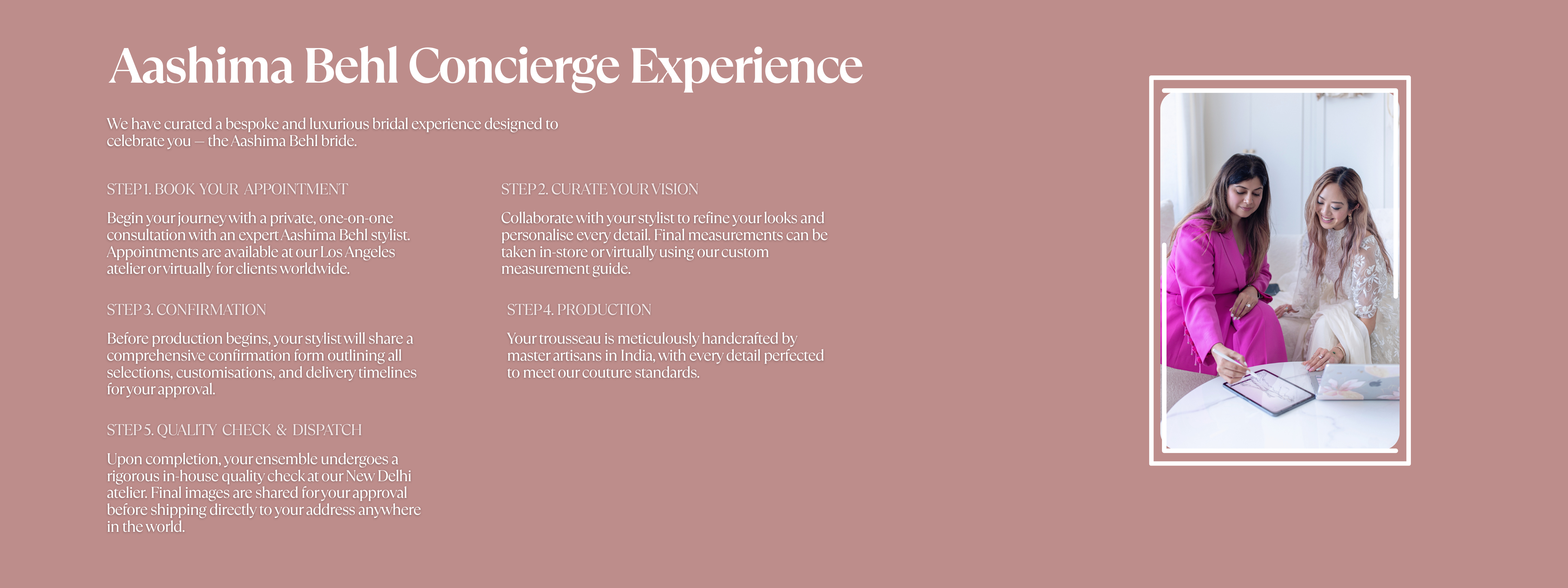 For all brides, AASHIMA BEHL requires there be at least a 1.5 month gap between the delivery timeline and event date. This means that for any bridal pieces that take 12 weeks, we require the bride to purchase and finalize 5 months in advance.
