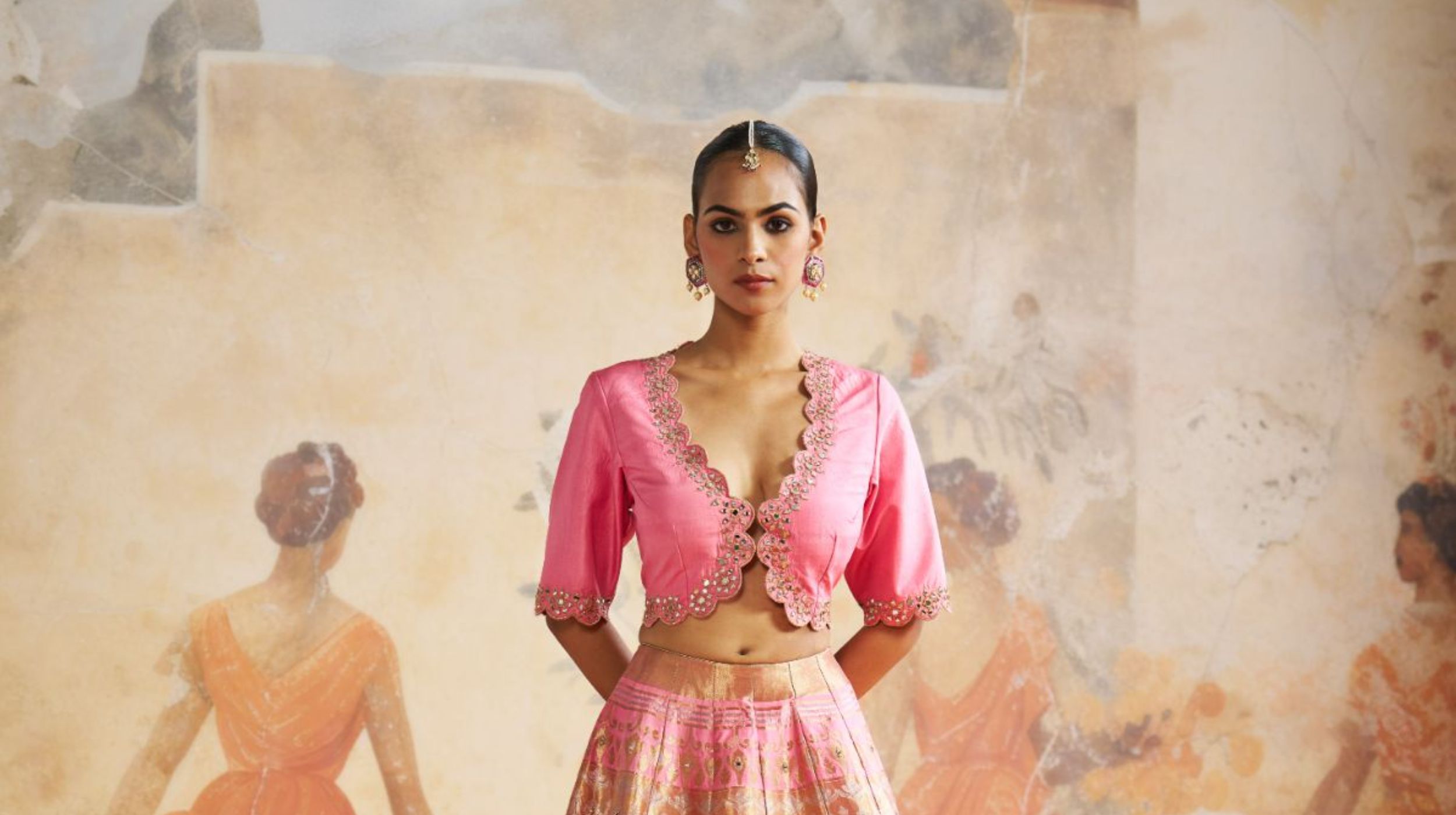 Our garnet red lehenga ornamented in zardozi and sequins, adorned in shades of flickering gold is paired with a breathtaking halter neck blouse studded with aureate sequence.