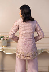 Fully embroidered asymmetric hem layered pink short jacket with flared pants.